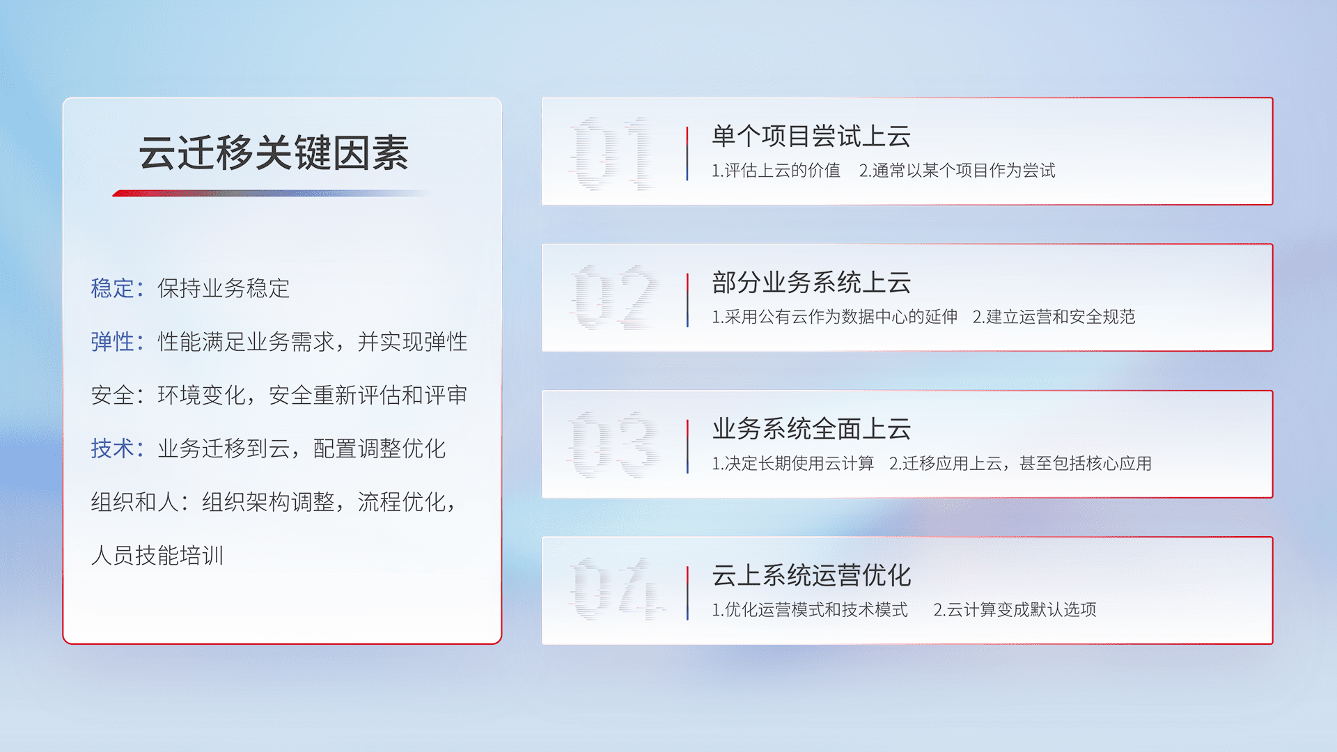 结合实际业务,,,,从规划设计、、、、云平台选型、、云原生改造、、、数据迁移、、、、集成交付,,,迁移全过程为客户识别最佳上云路径,,,做好风险识别管理,,,设计网络架构、、身份权限、、、、安全审计合规、、操作审计、、、日志审计、、、监控告警策略、、多站点容灾设计等,,对云上基础设施进行整体规划,,,提升IT治理水平,,以满足弹性、、高可用、、、高性能的需求。。