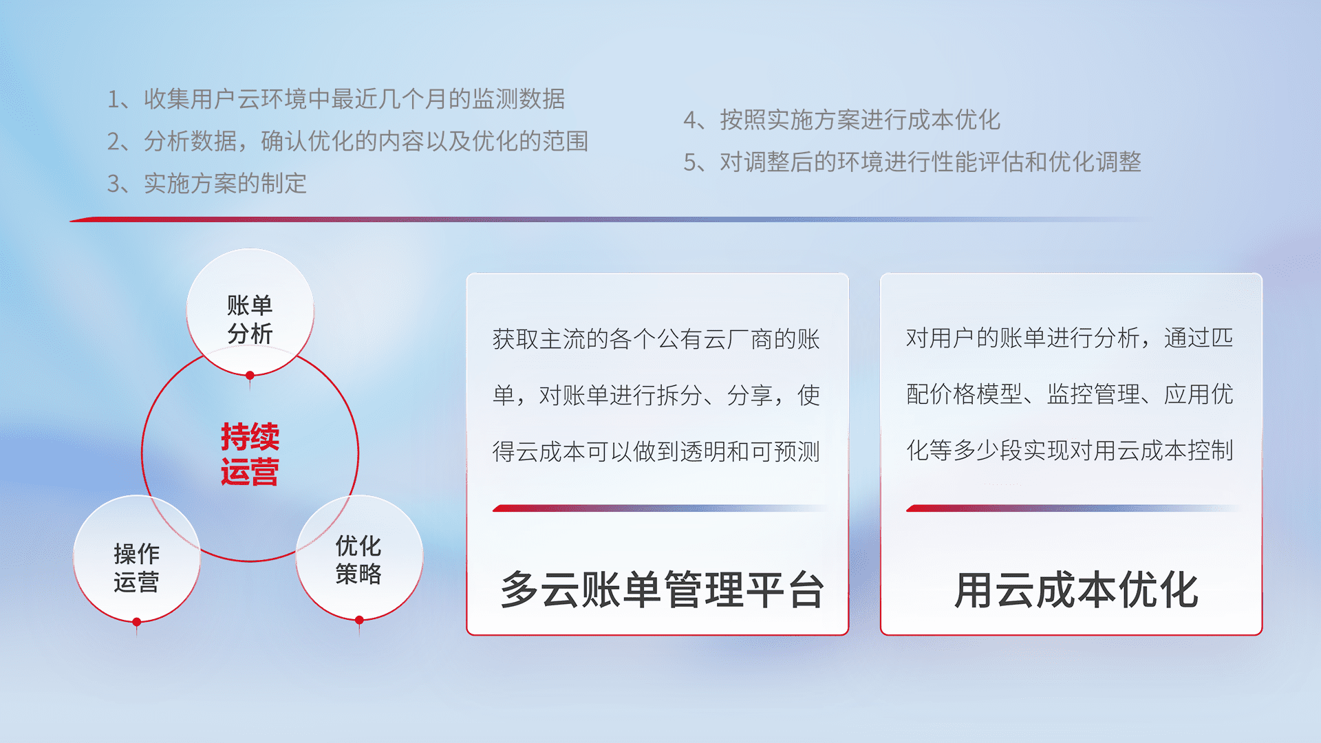 通过多云纳管,,,,以统一的资源数据模型把客户的云资源进行抽象和封装,,,,进而实现对多云资源的统一操作,,,,保障云资源管理的可靠性、、稳定性与可用性。。。量身定制化运维内容,,,,配置、、、开发运维、、、补丁管理、、备份、、监控、、、认证和访问管理、、、、审计和日常巡检等,,保障在用云过程中的可靠度,,,稳定度以及高可用率。。。